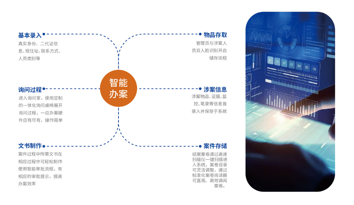 該系統涵蓋公安辦案整個(gè)過程的(de)各個(gè)環節,具備智能(néng)辦案提醒、案件(jiàn)分(πfēn)析、多(duō)層級審批、案卷電(diàn)子(zǐ)歸檔 管理(lǐ),全站(zhàn)信息檢索等功能(néng),并與各種配套硬件(jiàn)互通(tōng)信息形成軟硬件(j£iàn)結合辦案,極大(dà)地(dì)簡化(huà)了(le)辦案流 程、提升了(le)辦案效率。
